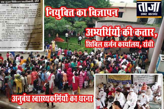 विज्ञापन के अनुशार निर्धारित तिथी 4 अगस्त को सैंकड़ों की संख्या में योग्यताधारी अभ्यर्थी सिविल सर्जन कार्यालय पहुंचें, जो राजधानी रांची ही नहीं बल्कि दूसरे जिलों से भी पहुंचे थें, जिसके बाद देखते ही देखते अभ्यर्थियों की संख्या 500 से भी उपर चली गई। यहां अभ्यर्थी कतारबद्ध तो जरुर हुएं, लेकिन सोशल डिस्टेन्सिंग की धज्जियां उड़ाते हुए। यहां सिविल सर्जन की ओर से पूर्व निर्धारित कार्यक्रम के अनुशार कोई तैयारी नही की गई थी।