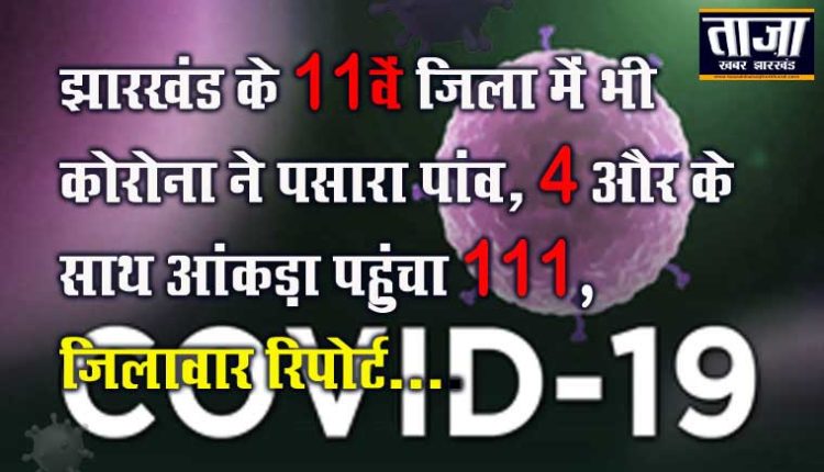 राँची: झारखंड में कोरोना वायरस संक्रमण की रफ्तार काफी धीमी हो चली थी, लेकिन एकाएक एक बार फिर से 30 अप्रैल को झारखंड में 4 और कोरोना पॉजिटिव मरीजों की पुष्टि हुई। गुरुवार को गोड्डा जिले से भी एक कोरोना पॉजिटिव मरीज की पुष्टि हुई, जिसके बाद अब झारखंड के 11 जिलों में कोरोना वायरत का फैलाव हो चुका है। गुरुवार को राजधानी रांची के हॉट स्पॉट, हिंदपीढ़ी से 2 भी दो मामले और रिम्स से एक मामला सामने आया है। इस तरह झारखंड में कोरोना पॉजिटिव मरीजों की कुल संख्या 111 हो चुकी है, जिसमें से तीन की मौत और 20 लोग संक्रमण से मुक्त हो चुके हैं।
