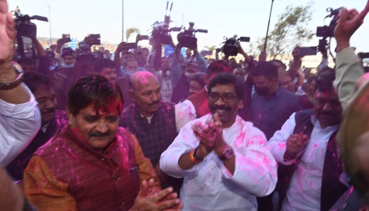 राँची: झारखंड विधानसभा परिसर में आज होली मिलन समारोह का आयोजन हुआ। इस समारोह में विधानसभा अध्यक्ष रबीन्द्र नाथ महतो, मुख्यमंत्री हेमन्त सोरेन, कई मंत्रीगण और विधायकगण शामिल हुए। सभी ने एक- दूसरे को अबीर -गुलाल लगाकर रंगों के त्योहार की खुशियां बांटी और होली की बधाई एवं शुभकामनाएँ दी। विधानसभा परिसर में मनाए जा रहे होली मिलन समारोह में पक्ष और विपक्ष सभी एक रन में नजर आए, इस अवसर पर फगुआ के गीतों ने माहौल को पूरी तरह होलीमय बना दिया।