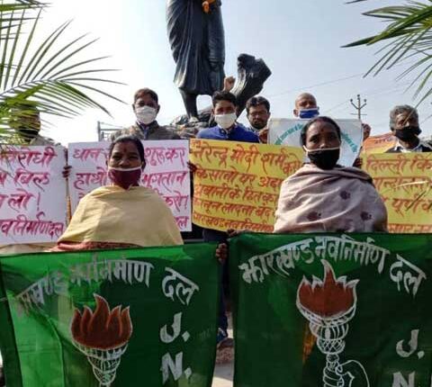 रांचीः झारखंड नवनिर्माण दल द्वारा दिल्ली में चल रहे किसान संगठनों के आंदोलन के समर्थन में राजधानी रांची के बिरसा चौक पर स्थित भगवान बिरसा मुंडा प्रतिमा के समक्ष प्रदर्शन किया गया। इस दौरान नरेंद्र मोदी सरकार शर्म करो, नया कृषि बिल अविलंब वापस करना होगा जैसे नारे लगाए गएं।
