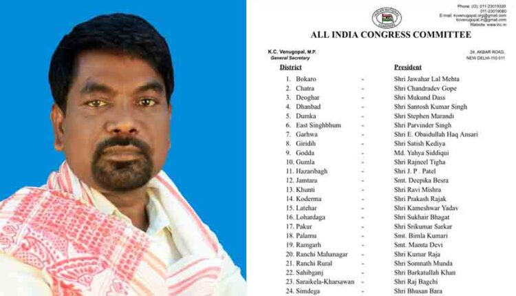 रांची(कांके प्रखंड): शनिवार को कांग्रेस पार्टी के राष्ट्रीय महासचिव के सी वेणुगोपाल ने झारखण्ड कांग्रेस के 25 जिला अध्यक्षों कि सूची जारी की है, जिसमें कांके प्रखंड के प्रमुख सह कांग्रेस नेता सोमनाथ मुंडा को ग्रामीण कांग्रेस, रांची जिला का अध्यक्ष नियुक्त किया गया है, वहीं रांची जिला महानगर अध्यक्ष के रूप में पुनः एक बार फिर से कुमार राजा को जगह दी गई है।