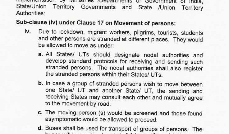 नई गाइडलाइन के मुताबिक सभी राज्यों और केंद्रशासित प्रदेशों को नोडल अधिकारी नियुक्त करने और ऐसे फंसे हुए व्यक्तियों को वापस भेजने और लेने के लिए एक एसओपी की तैनाती करनी होगी। नई गाइडलाइन के तहत एक राज्य से दूसरे राज्य में जाने के इच्छुक लोगों के लिए राज्यों को पहले आपस में समन्वय स्थापित करना होगा।