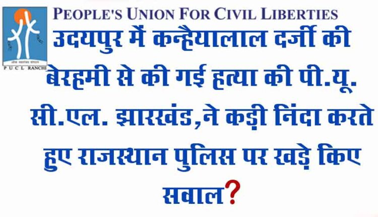 उदयपुर में कन्हैयालाल दर्जी की बेहरहमी से की गई हत्या की पी.यू.सी.एल झारखंड ने कड़ी निंदा की, उदयपुर की पुलिस और सरकार से माहौल शांति पूर्ण बनाए रखने के लिए हर संभव उपाय करने के अपील भी की…