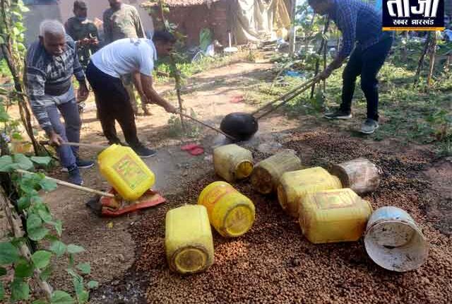रांचीः राजधानी रांची के पिठोरिया थाना क्षेत्र अंतर्गत गोडाइत टोली और नीचे मुहल्ला में अवैध देशी शराब निर्माण कर्ताओं के खिलाफ पिठोरिया थाना प्रभारी विनय कुमार के नेतृत्व में छापेमारी अभियान चलाया गया। छापेमारी के दौरान पिठोरिया थाना के पुलिसकर्मियों द्वारा लगभग सवा दो क्विंटल जावा महुआ नष्ट किया गया। इसके अलावा देसी शराब निर्माण में लगने वाले सामग्रियों को भी नष्ट किया गया।