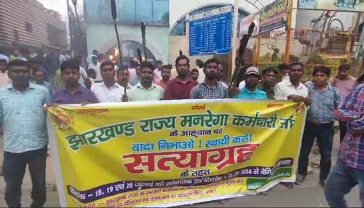 मशाल जुलूस के माध्यम से अनिश्चितकालीन हड़ताल की घोषणा की गई। मौके पर संगठन के प्रदेश अध्यक्ष, जॉन बागे ने कहा कि सरकार बिल्कुल ही निरंकुश हो गई है। जान बुझ कर मनरेगा कर्मियों को हड़ताल करने पर विवश किया गया हैं। सरकार ने मनरेगा कर्मियों को झूठी आश्वासनों के अलावा कुछ नहीं दिया। ग्रामीण विकास मंत्री का आवास घेराव, विधानसभा घेराव, 100 किलो मीटर पद यात्रा, मुख्यमंत्री आवास घेराव सभी जिला मुख्यालयों में धरना प्रदर्शन होने के बावजूद अब तक मनरेगा कर्मियों की मांगों पर कोई संज्ञान नहीं लिया गया, जो राज्य सरकार की निरंकुशता को दर्शाता है।