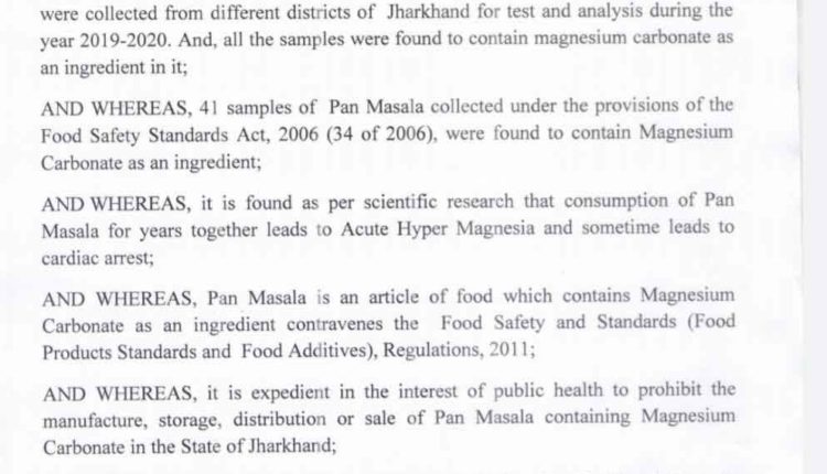 झारखंड सरकार ने पान मसालों पर लगाया 1 वर्ष का प्रतिबंध…