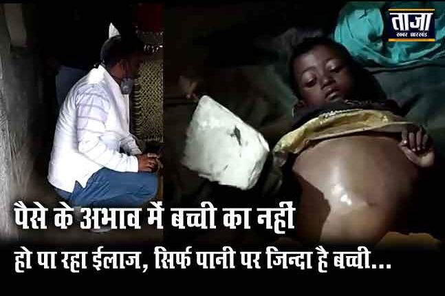 राँचीः राजधानी रांची से महज 30 किलोमीटर दूरी पर स्थित कांके प्रखंड के उरुगुट्टू पंचायत स्थित टीनागढ़ा गांव जहां ईंट भट्ठा मजदूर, बृज बैठा अपनी 5 वर्षीय पुत्री का ईलाज पैसे के अभाव में नही करवा पा रहे हैं और बच्ची दिन रात दर्द से तड़प रही है। बच्ची का पेट काफी फूल गया है और बच्ची खाना खाने में सक्षम नही है। वर्तमान में बच्ची सिर्फ लिक्विड के सहारे ही जिन्दा है। ये परिवार पैसे के अभाव में अपनी बच्ची को अस्पताल नही ले जा पा रहे हैं और बच्ची का ईलाज गांव में ही ओझा-भगत से करवा रहे हैं।