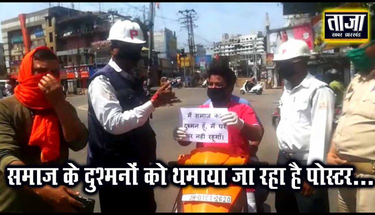 राँची: झारखंड में लॉक डाउन के दूसरे दिन नियमों का उल्लंघन करने वाले लोगों के साथ अब प्रशासन सख्ती के साथ पेश आने लगी है। ट्रैफिक विभाग को यह निर्देश दिया गया है कि जो भी व्यक्ति बिना आवश्यक कार्य सड़कों पर नजर आते हैं, उन्हें दंडित किया जाए। इस आदेश के बाद ट्रैफिक विभाग ने अनोखे पहल करते हुए, जो लोग नियमों का उल्लंघन करते नजर आ रहे हैं, उनके हांथ में एक पोस्टर थमा दे रहे हैं, जिसमें लिखा हुआ है कि, मैं समाज का दुश्मन हूं, इसलिए मैं घर में नहीं रहना चाहता।